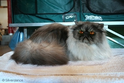 Her mother, CFA CH / GEC Estagel Candygirl of Silverdance, is a (black)‑tortie‑smoke persian female. Her father, CFA CH / WCH and Owner of RVDE Quality Seal My Fantasy's Blue Ice Sensation of Silverdance, is a blue‑smoke persian male.